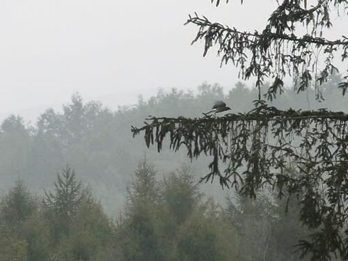 飛び立とうとしているカケス 今日は天気予報どおりドンヨリした雨の朝です。 今朝もコーヒーを飲みながら夫と畑を眺めていると、お隣さんの背高ノッポの松の木でカケスが3羽お食事中でした。 頭がオレンジがかっていて翼に青が入ったチョット大柄の綺麗な鳥…