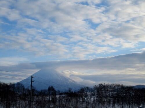 羊蹄山に面白い雲がかかっています。 今日は暖かいからなのか外窓の下に沢山の虫が並んでいます。